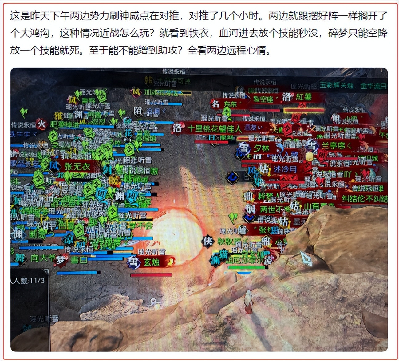 参与跨服对抗的玩家太多了,两帮玩家相互交锋后,很快就会形成“楚河汉界”的格局,开始远距离对轰。在这种模式下,小规模战场中可以凭借健硕的身板和灵活的走位占尽优势的近战职业,在上千人规模的大战中就成为了“炮灰”。