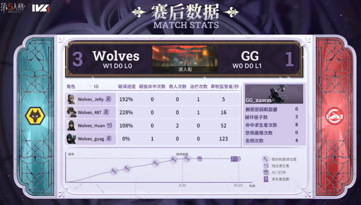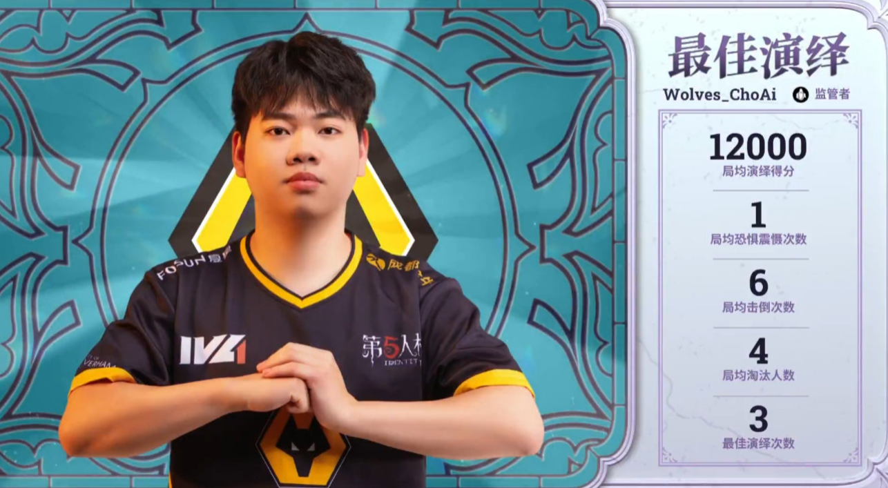 比赛进行到第二局下半场后,却成了成都Wolves战队监管者的个人秀。选出守夜人,面对GG战队舞女、“心理学家”、空军与大副的阵容时,开局直接闪现击倒舞女,中期又围绕密码机展开完美控场,最终将求生者逐个击破完成4抓,成都Wolves战队也凭借着12:5的总比分成功赢下整场比赛。