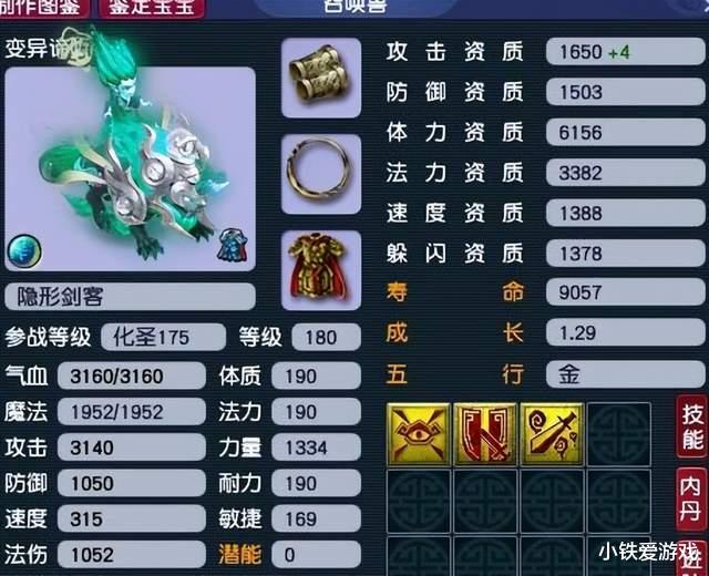 这个谛听我们看到是变异的,颜色就显得有点不一样。这个资质只能用一个暴力来形容,直接拉到了1650点,然后我们看到全力加点之后,攻击到了3100多。技能上面是真的少,出了观照之外,就一个惊心一剑和壁垒,因为这两个主动技能兽诀书是很便宜的。