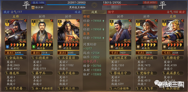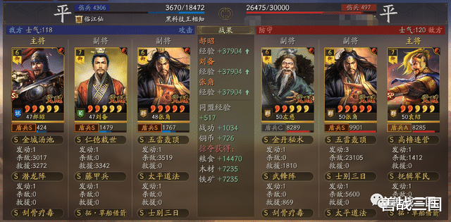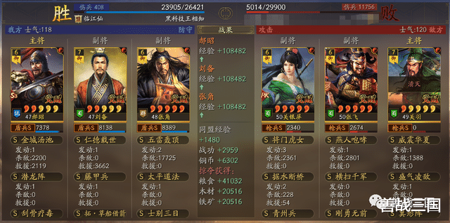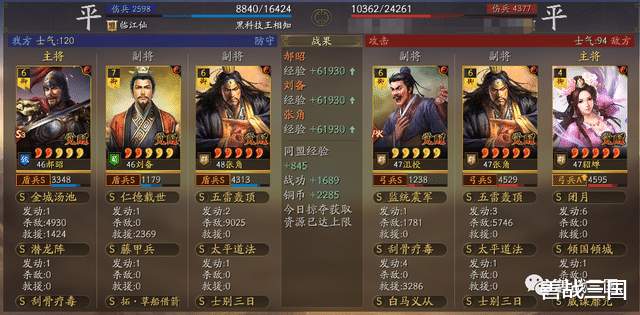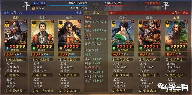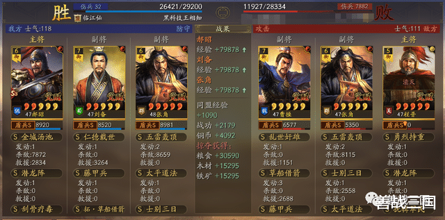 比如下边这场对战满红诗诗盾,双方张角都是2次五雷轰顶伤害差不多,而双方都带的是藤甲兵,这时郝昭的优势就显现出来了,金城汤池烧近9000伤害,比双方张角的五雷伤害都高