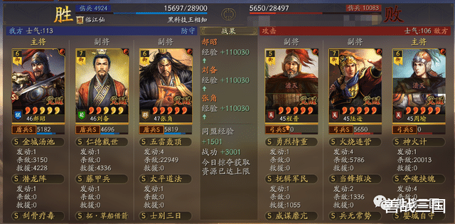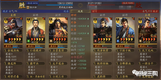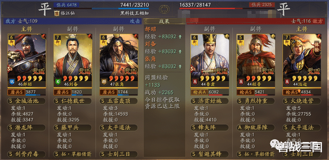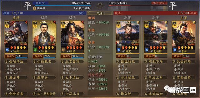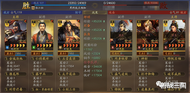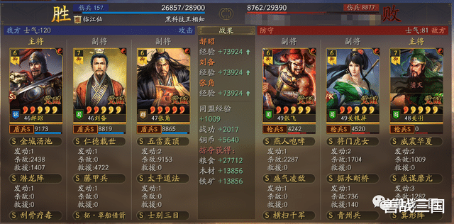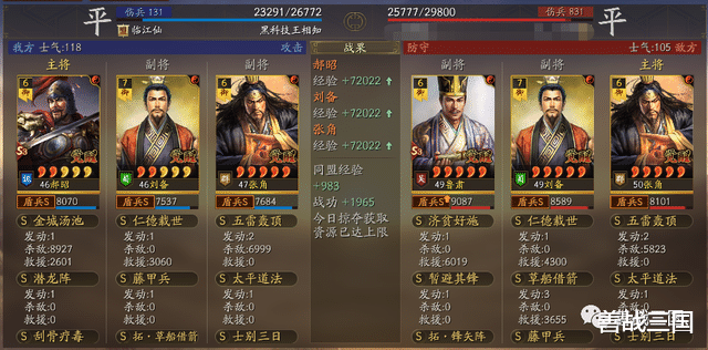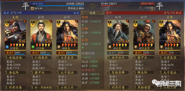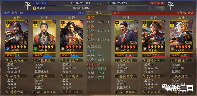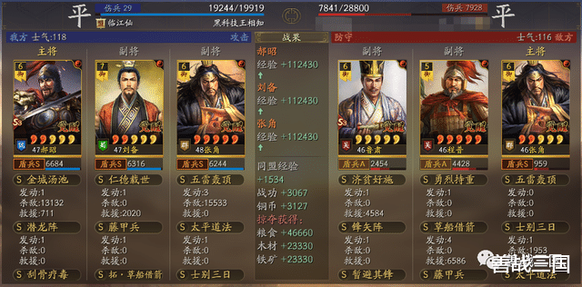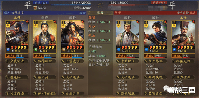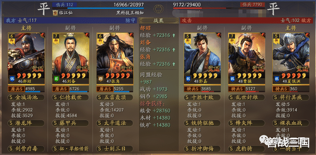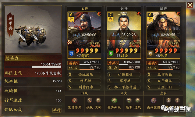 面对突击队时郝昭也会有被爆头的风险,所以给张角搭配援助甲,利用藤甲兵+潜龙阵副将给的大概总量55%兵刃减伤,以及士别三日的30%规避,去抗突击保护全队