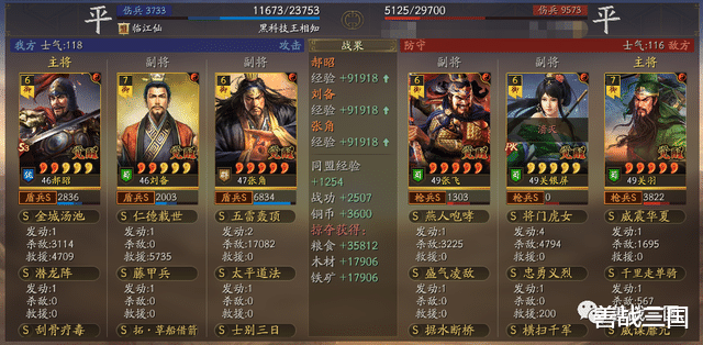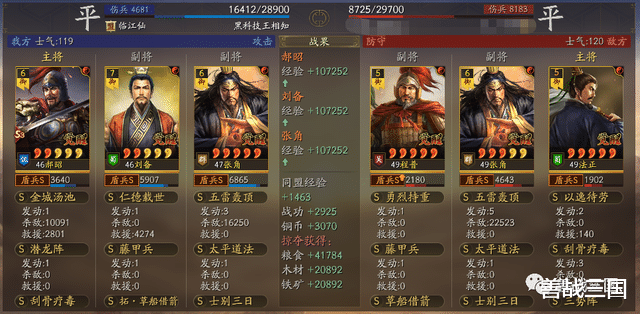 这一场对方的张角其实没拿到鲁肃的属性,因为张角比刘备高1级(多100兵力),而雷火盾这边郝昭和带了士别张角不能普攻,只有刘备自己普攻砍到对方有暂避+藤甲减伤的张角身上,连100都砍不到,没能让张角降到比刘备兵力更低去拿鲁肃的属性