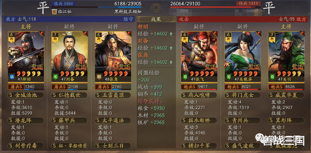 不过这里是满红张角,自带兵书13%的减伤效果,如果低红张角的话建议刮骨疗毒改成暂避其锋保张角,再搭配援助甲抗突击