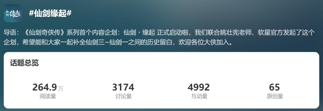这意味着任何仙剑爱好者都能参与到创作之中,参与方式包括但不限于文字剧情、动漫、动画、游戏等各类形式。从粉丝反馈来看,这样的形式还是受到了官方的关注和积极的参与。截至发稿,游戏的微博话题已有约265万阅读量。