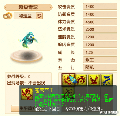 2013年12月3日,超级神兽“超级青鸾”降临三界。这只神兽所携带的特殊技能“苍鸾怒击”一直深受玩家喜爱,然而神兽并不能合宠炼妖,让这技能一度没有用武之地。