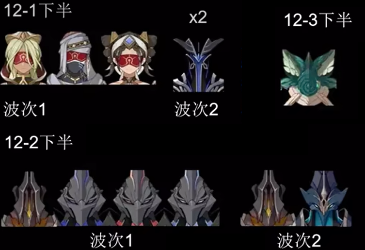 下面再来看下下半,12-1下半,第一波是镀金旅团召唤师带两个小怪,与上半是一样的,也是先打掉厄灵就可以,第二波会有两只水使徒,这样的话12-1下半带草系或者冰系会比较好过,12-2下半会有空壳怪,并且有岩黑蛇骑士,这间的话要有对群能力,用万达或者冻结队、激化这些队都可以,12-3下半,沙虫进深渊,全抗55%,风抗90%。这个沙虫对风系很不友好,另外沙虫的风蚀弹的生成位置与地面会有一定距离,所以最好有一个能对空的角色。