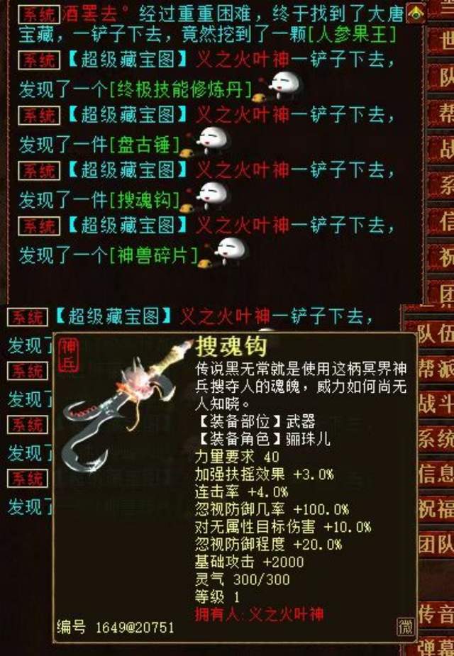 一共四张超级藏宝图,挖出了两件神兵一个神兽碎片和一个终极丹,其中一个还是扶摇破,算下来至少有500块钱了吧?