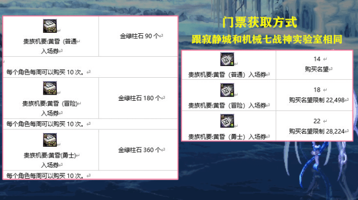 普通门票一张,只需要90个金绿柱石,1个角色1周能买10张;冒险门票一张,需180金绿柱石,1个角色1周能买10张;勇士门票一张,需360金绿柱石,一周能买10张。