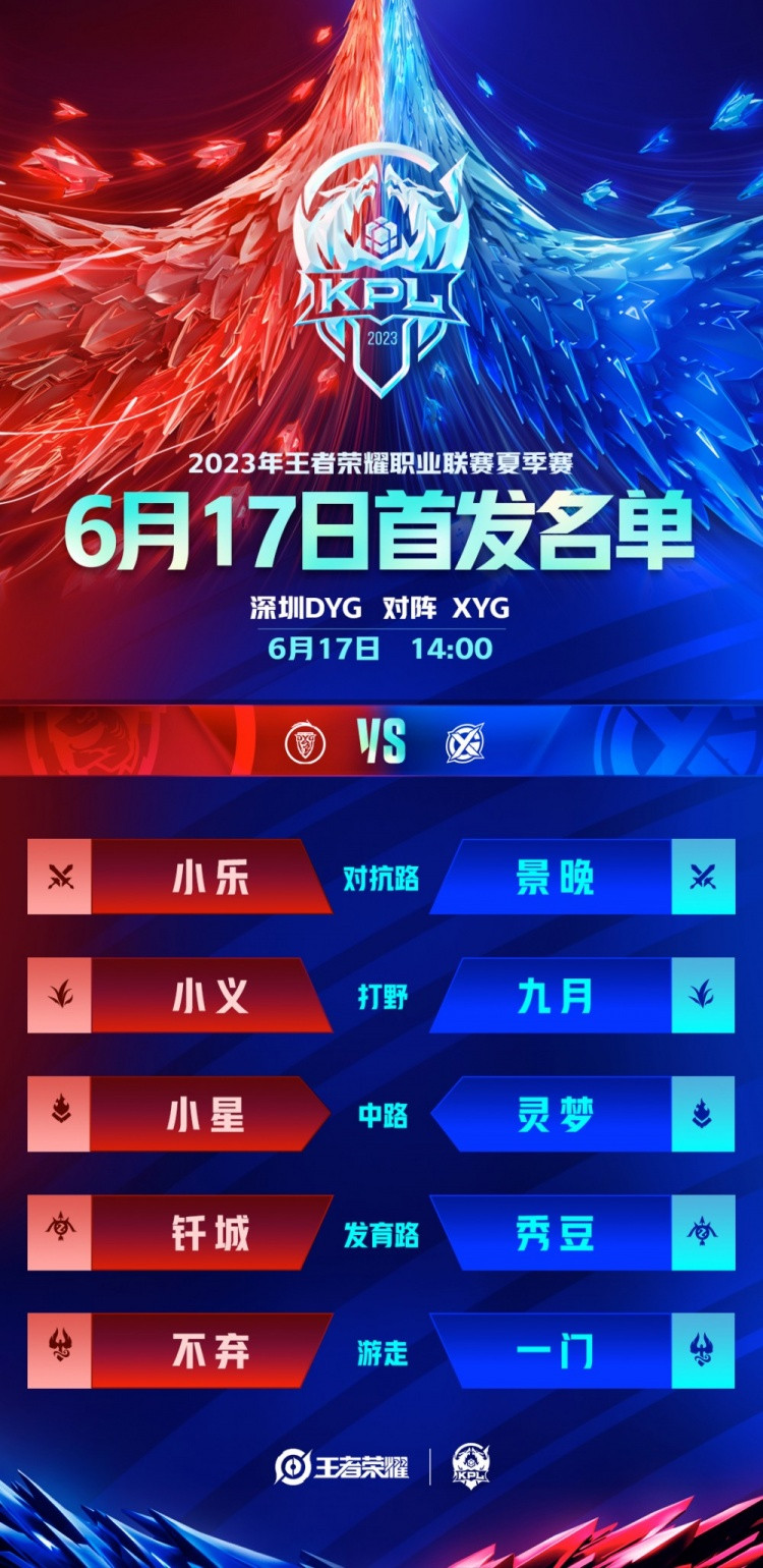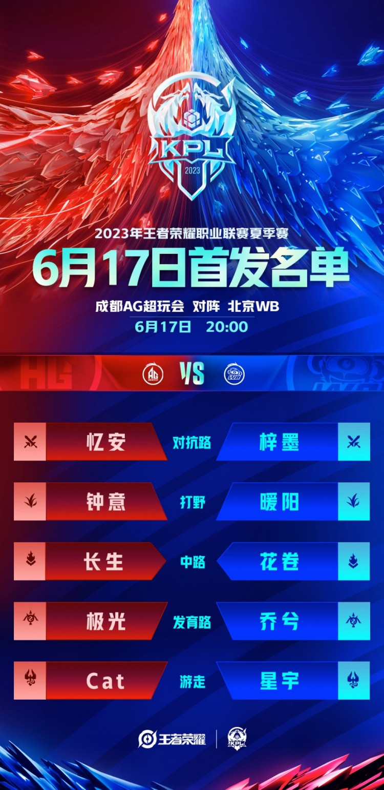 直播吧6月17日讯2023KPL夏季赛常规赛第一轮W1D4有三场对决,赛前KPL赛事官博公布今日首发名单。