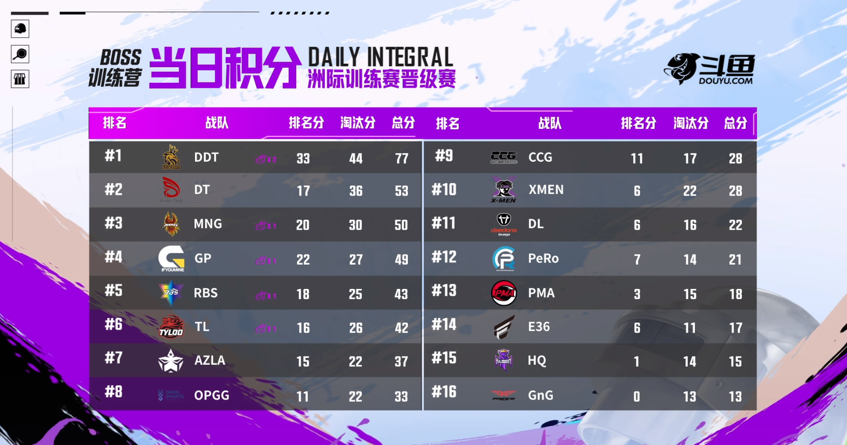 绝地求生洲际训练赛败者组阶段即将结束,根据赛制规定,败者组前八名的队伍将进入下一轮的决赛,前几场比赛打完后DDT,DT,MNG和天禄已经确定晋级,从第5名34分的GP到第10名25分的CCG都有机会争夺剩下几个名额,但19分的PeRo则需要一把大分才能追上去,最好还得是吃鸡局,毕竟不能指望中游的队伍不拿分,对PeRo来说难度挺大的。还有大家最近比较关注的RBS,随着薄凉的加入,大家也越来越期待他们和天禄后面会擦出多大的花火,作为观众我还是很期待他们能进入决赛的。