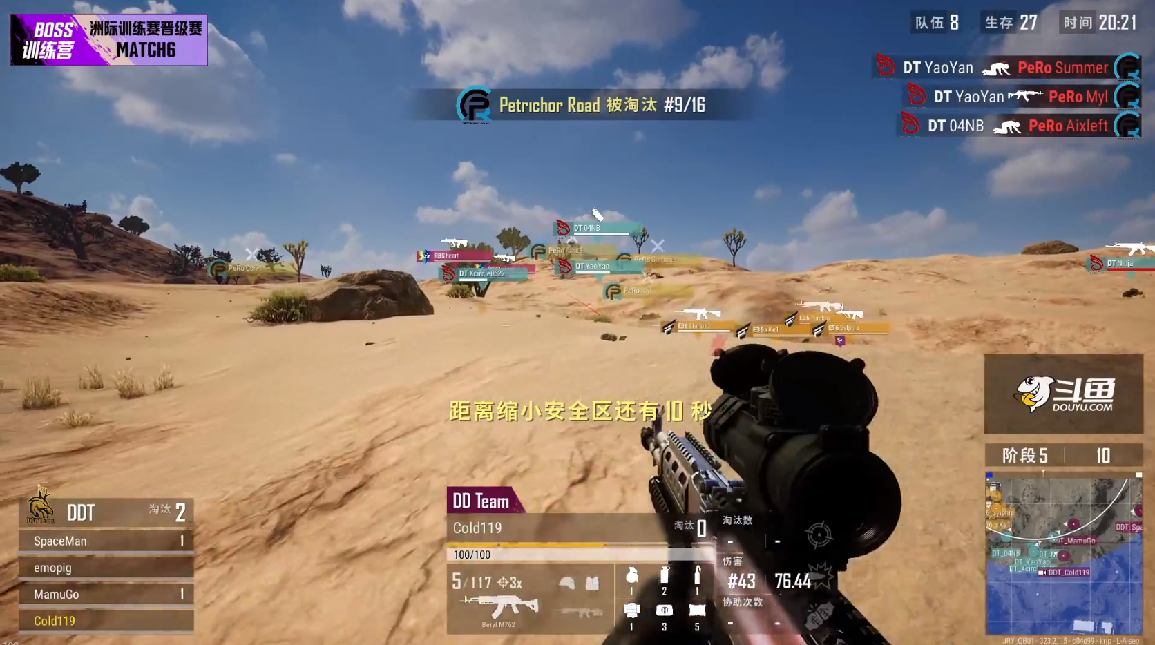 下班局的航线从大E城飞向impala,前期没有队伍抢点,阶段2圈形刚缩到CCG就在野区把PMA团灭,但后续被PeRo接盘,这样一来CCG就无缘决赛了,看看PeRo能否拿起他们的剧本。HQ空降到了GP脸上连续减员,而且安全区还把他们刷走了,这波有点亏了,不过GP为了保住前八非常求稳,没选择去清HQ,同样是四人空降到了圈中心的厕所,南边的PeRo也不太妙,在推进途中被拉开枪线的DT包围瞬间团灭,看来是没有剧本了。