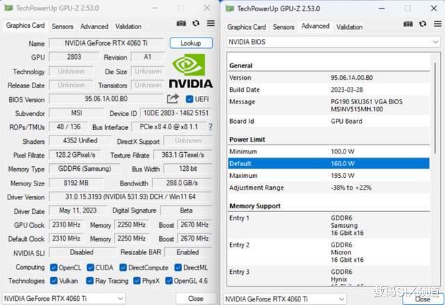 从GPU-Z可以看出微星GeForce RTX 4060 Ti魔龙显卡可以看出RTX 4060Ti与完整AD106核心相比阉割了其中1个GPC中的1个TPC,即AD106-350由3个GPC构成,其中2个GPC包含6个TPC,1个GPC包含5个TPC,每个TPC拥有两组SM,共计为34组SM,即4352个CUDA。核心频率为2310-2670MHz,电源输入接口为8pin。采用8GB GDDR6显存,显存位宽为128-bit,显存带宽288GB/s,等效速率为18Gbps。微星RTX 4060 Ti 魔龙显卡的默认功率为160W,最大功率为195W。