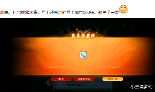 上面这位玩家已经可以被开始狗托了吧,这位玩家玩成了神器序章以后发现角色上还有300多的仙玉,然后就买了一个情缘晶币,结果这一个情缘晶币就直接开出来了潮汐帆板的稀有武器装饰。