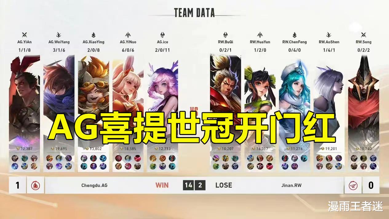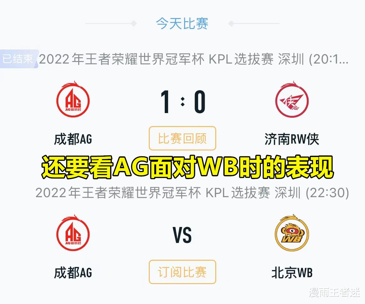 当然,也不能因为AG超玩会拿到了世冠开门红就高兴太早,这毕竟只是1小局胜利而已,还不能说明什么。要知道AG超玩会后面还有WB要打。咱们接下来看一下AG超玩会面对WB时的表现,就大概率能够知道这一场开门红到底是AG超玩会打得好,还是RW侠自己发挥失常了。要是AG超玩会连WB都能够拿下,估计有粉丝要直接喊出“剑指”的口号了。
