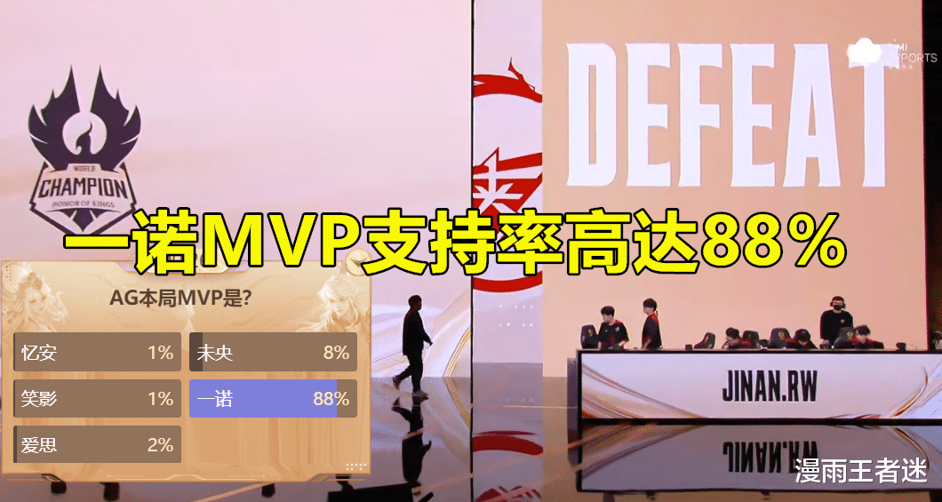 在这一场比赛结束之后,MVP的评选结果出来之前,不少观众朋友都对此次的MVP进行了投票,小伙伴们可知道一诺的MVP支持率有多高吗?要知道一直以来,外界对于一诺都是比较苛刻的!也因此呢,一般情况下,一诺表现差的话,很多时候都会被无限放大,被外界各种冷嘲热讽。而一诺表现好的时候,又总是不会获得那么多的认可。然而这一回一诺的MVP支持率确实是有点高,高达88%!由此可见一诺这一战的整体表现有多好。