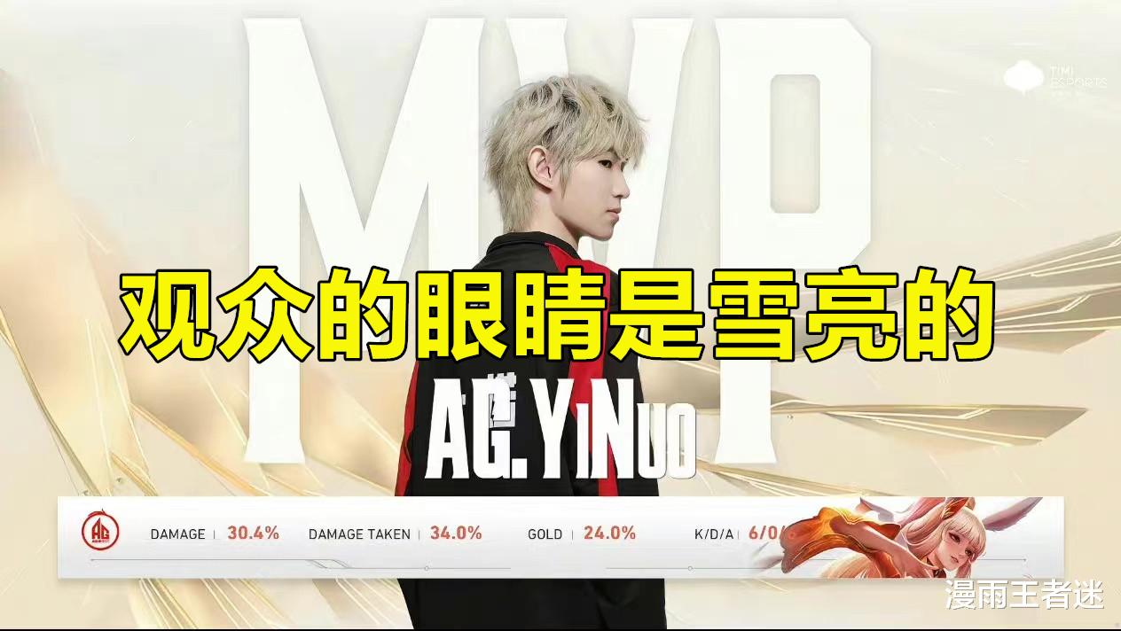 这一战一诺使用的英雄是公孙离。而最终MVP给到一诺的公孙离,观众的眼睛确实是雪亮的。夸了一诺这么久,漫雨想说一句比较损的话,那就是这一战中的一诺,真的有点儿陌生。为什么这么说呢?因为以往的一诺,他的射手总是会在大优势的时候就送人头,然后掉大节奏,给到对手翻盘的机会。然而这一战从头到尾,一诺没有掉过一次人头,没有掉过一次节奏,这你就真的尴尬了。