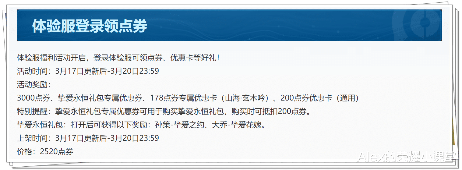 3月17日更新后-3月20日,登陆体验服可领取3000点券以及多张皮肤优惠卡,有体验服的小伙伴记得登录游戏领取奖励。