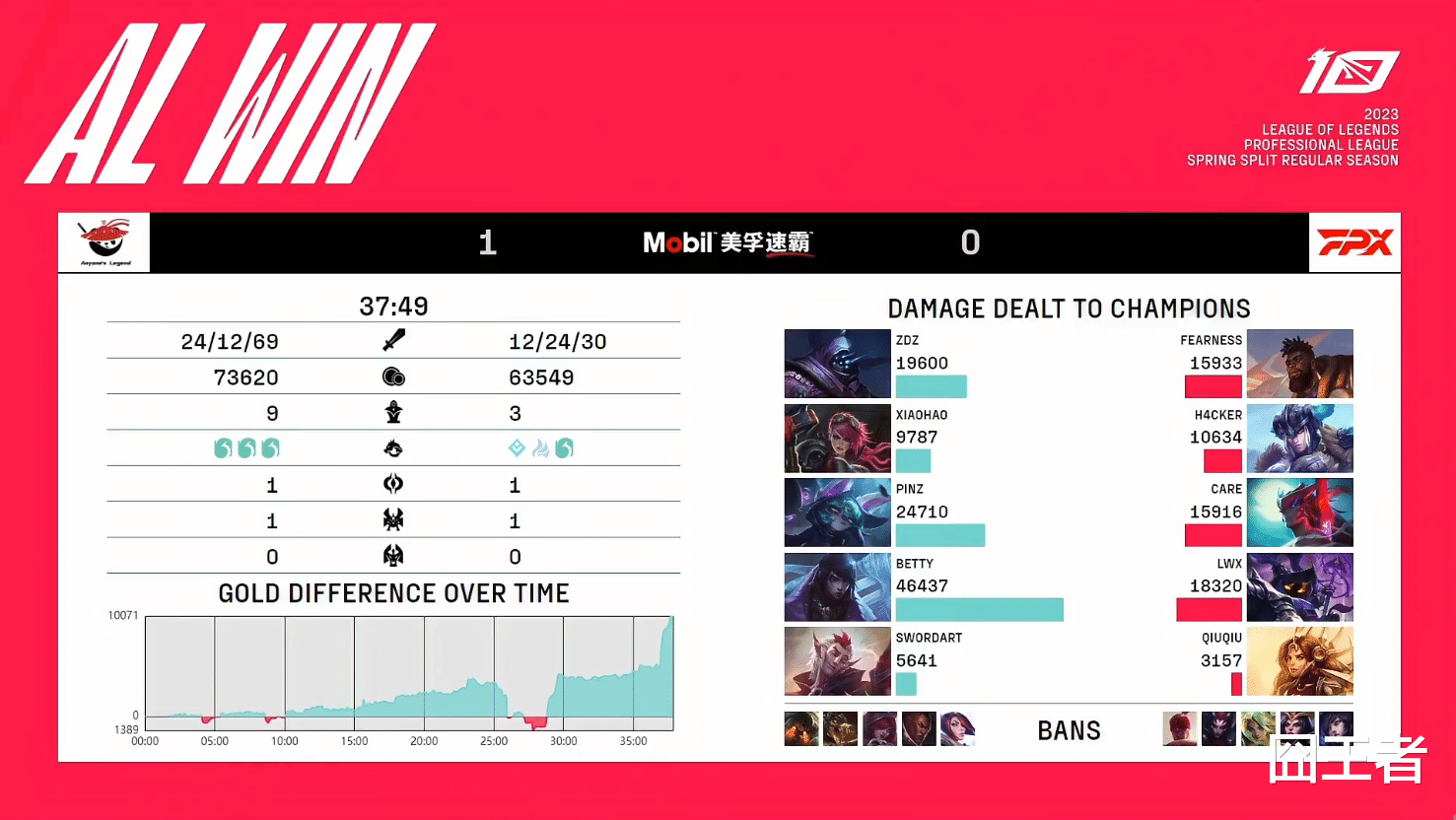 无缘季后赛的两队,在第一局比赛中,果然没有让玩家失望。两队从一开始,就进入了大乱斗模式,双方在37分钟的比赛内打出了36次击杀。可以说不是在打架,就是在去打架的路上。前15分钟,双方打比较胶着,AL不断抓单得手,建立起了近2K的经济优势,而FPX则是控下前三条小龙。在后期的比赛中,AL不断通过小范围团战,逐步扩大优势,而FPX则是显得畏手畏脚,就算在25分钟左右拿下第一条大龙,也没能改变小凤凰失败的趋势。37分49秒,AL在拿下第二条大龙后,团灭FPX,随后一波赢下比赛!