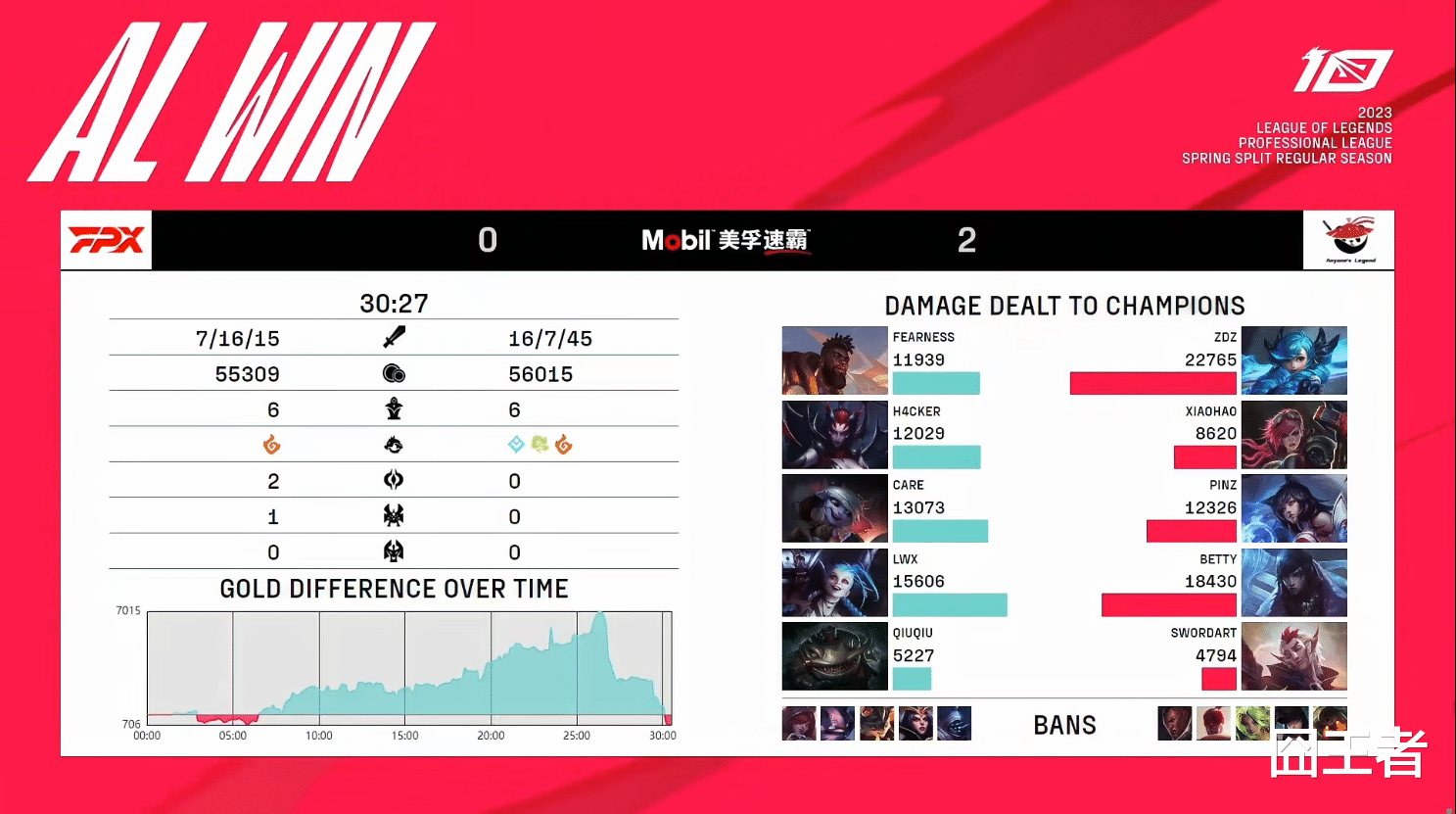 在比赛的26分钟,FPX领先7K经济时抱团推中,结果反被AL在中路打出了个0换5,瞬间抹平了7k的经济差距。落后7K的经济的AL,能打出0换5,这种团战,囧王者认为简直匪夷所思。扳平了经济的AL,随后在30分27秒,轻松一波赢下整场比赛。